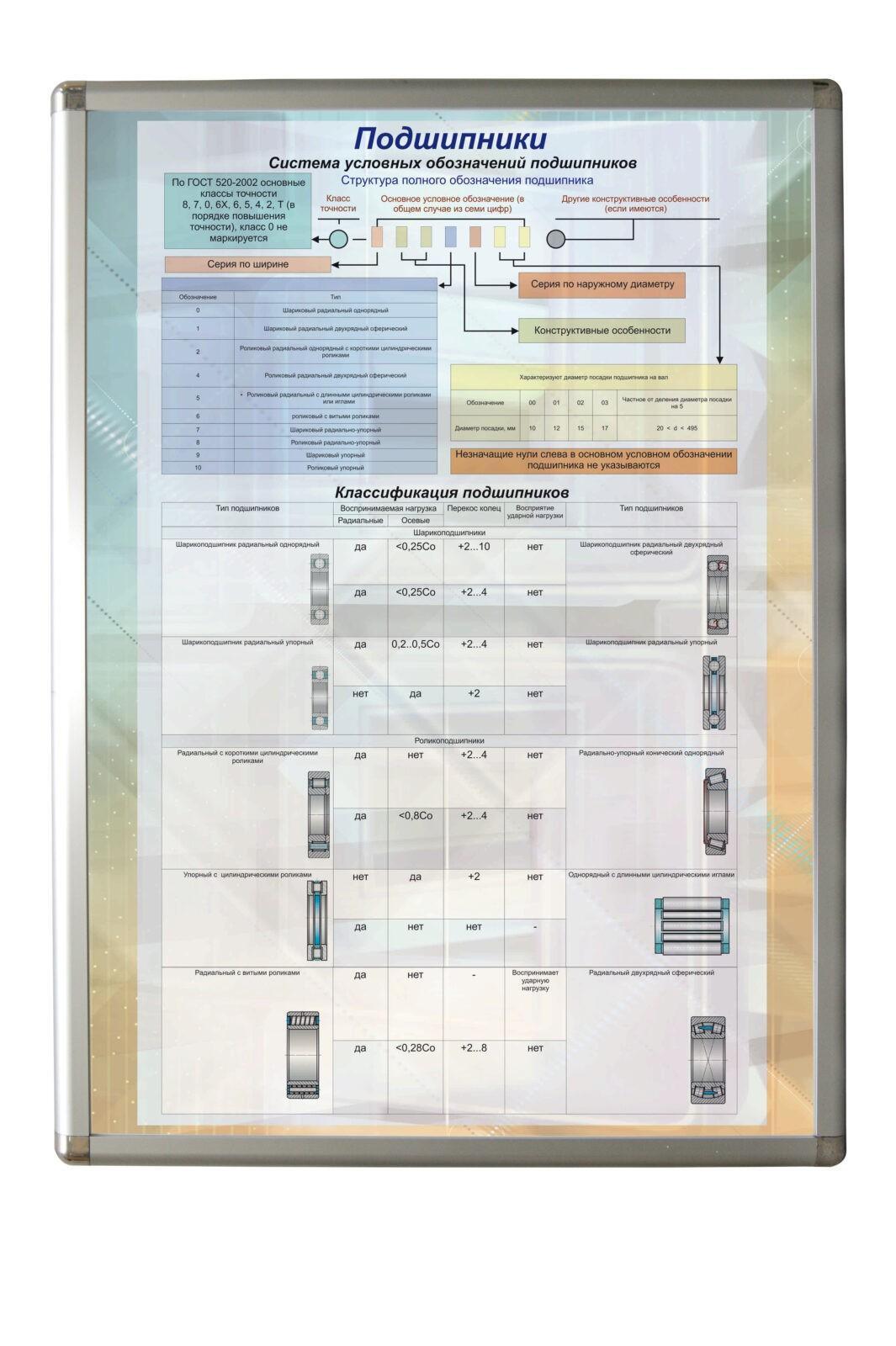 На плакате размещена система условных обозначений подшипников, их характеристики и классификация. Планшет изготовлен из фанеры с наклеенной на нее подложкой из пластика с полноцветной печатью. По периметру плакат окантован алюминиевым профилем. Верхний профиль имеет подвесы для крепления планшета к стене. Подвес, в виде петли, вставляется в паз, расположенный на задней стороне профиля и крепится с помощью винта, что позволяет регулировать расстояние между подвесами. Подвес вешается на винт, закрепленный в стене.