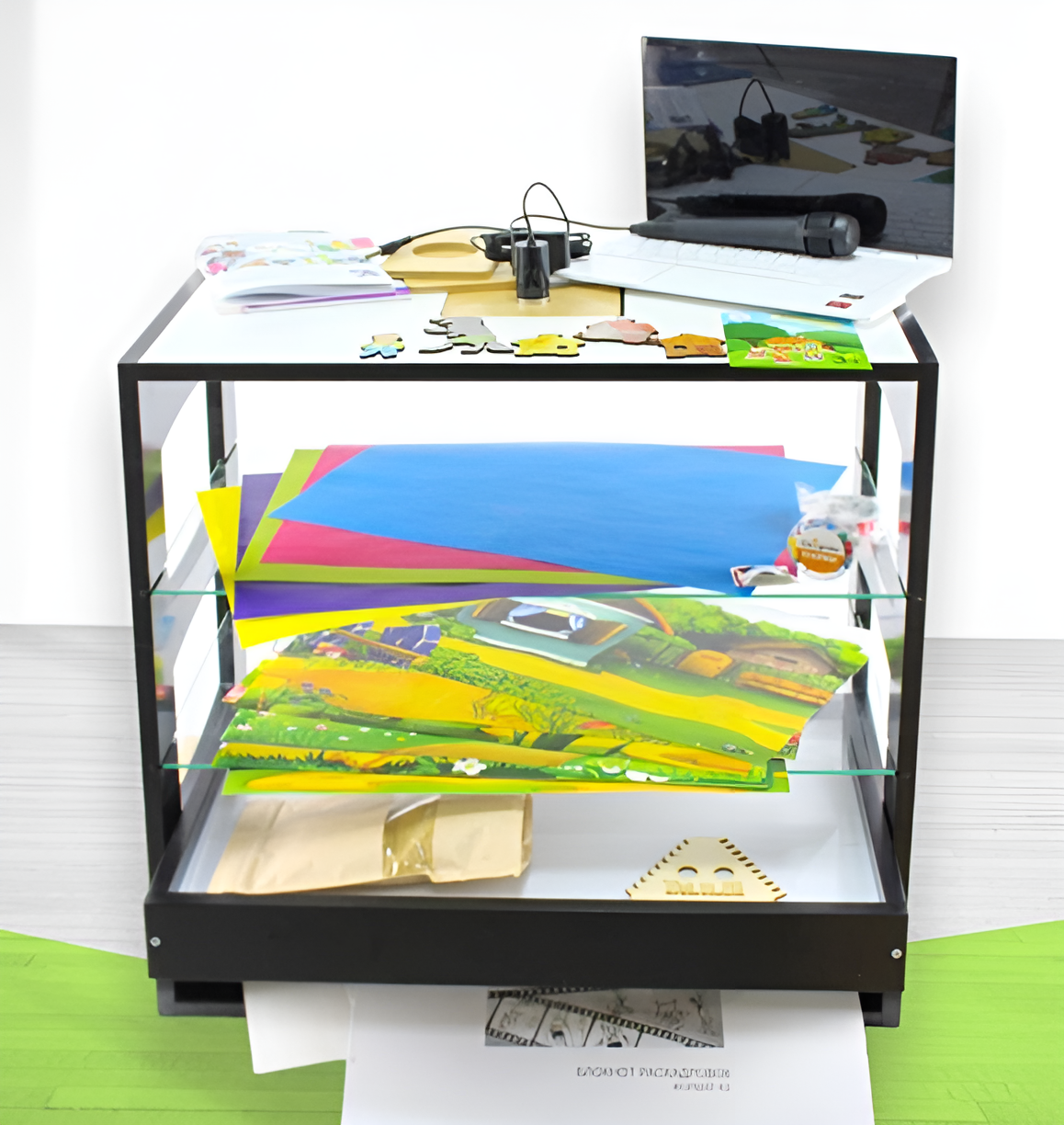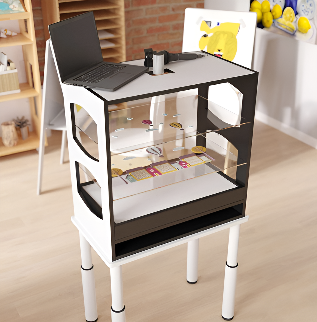 Комплект включает в себя мультстанок для создания анимации с использованием техник бумажной, пластилиновой и песочной перекладки, изготовленный из ламинированной МДФ и кварцевого стекла. Устройство оснащено встроенным световым планшетом для песочной анимации с белой светодиодной подсветкой, который можно использовать как в составе мультстанка, так и отдельно. Для фиксации изображений предусмотрена камера с высоким разрешением и частотой съемки, которая обеспечивает четкую и качественную запись видео. В комплекте также идет программное обеспечение — видеоредактор, предоставляемый в виде ссылки, который позволяет легко монтировать созданные мультфильмы.