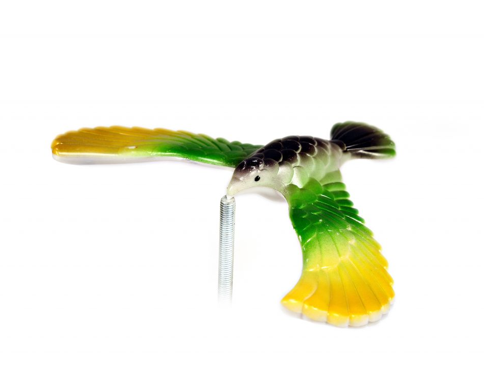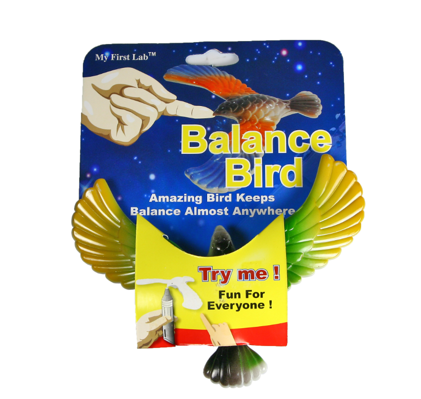 Пластмассовая фигурка птицы сбалансирована так, что удерживает равновесие держась только клювом за какую-либо поверхность (палец, карандаш или др.) Такая игрушка очень точна дает пояснение такому явлению, как баланс.