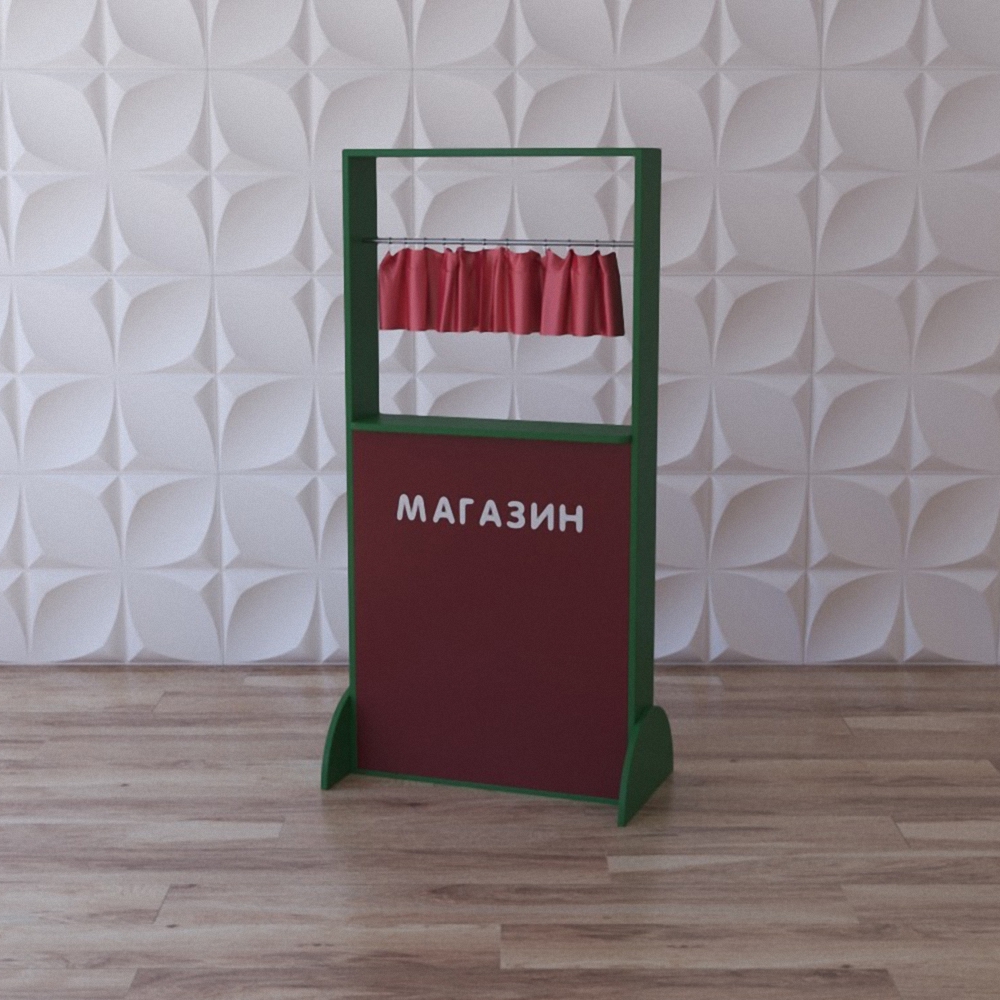 Ширма для тактильно-развивающих игр - это игровой модуль для обустройства различных учреждений – детсада, яслей, театральных и творческих кружков для самых маленьких деток (дошкольников). Выкрашена в бордовый и темно-зелёный цвета, состоит из устойчивой деревянной основы, не имеющей острых краёв и углов, к которой прикреплена штанга для размещения плотной декоративной укороченной тканевой занавески.