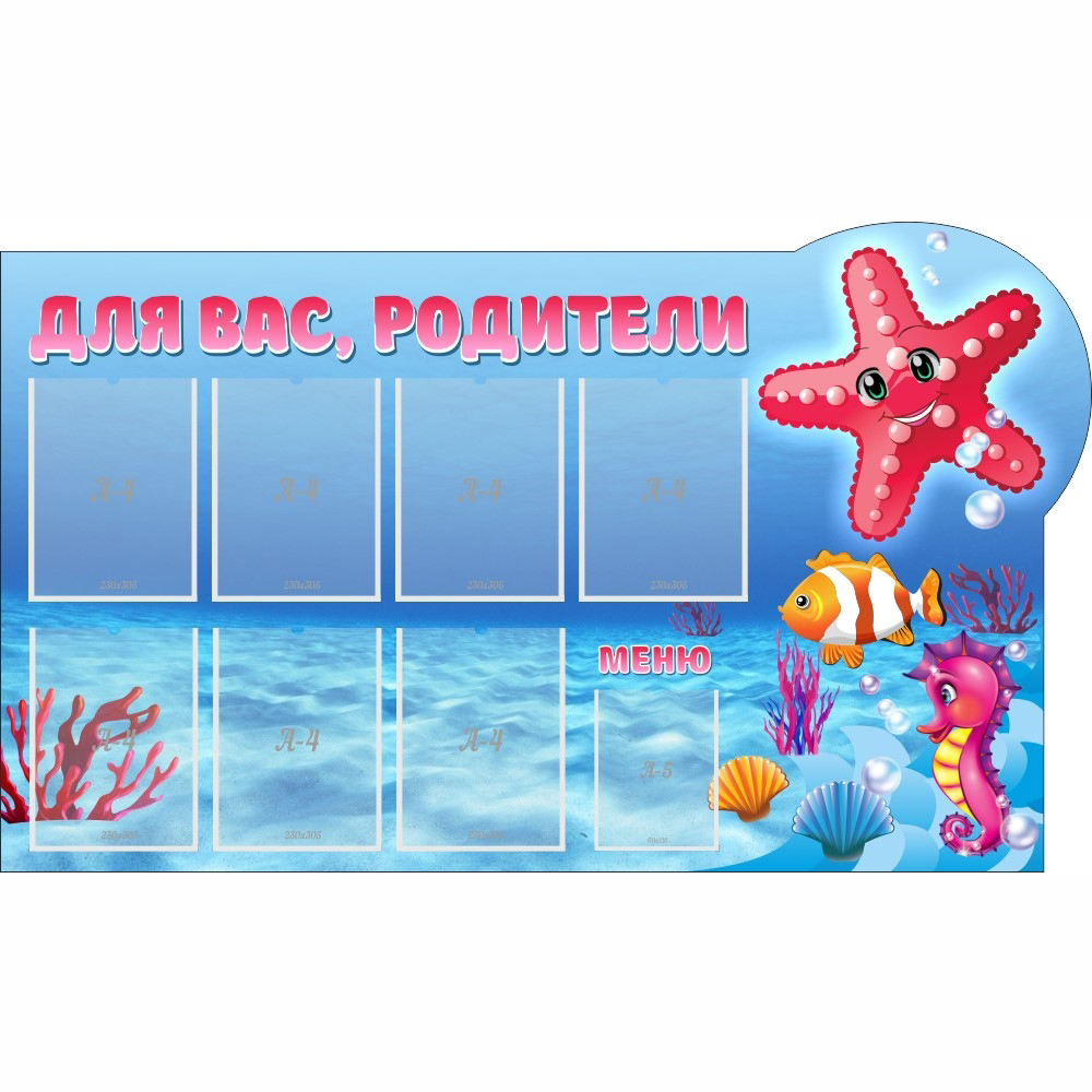 Качественный и красивый, информационный стенд для родителей должен быть в каждом детском саду. Потому что это действительно необходимо. Ведь есть специальная информация, с которой должен быть ознакомлен каждый родитель. И стенд сможет донести ее до каждого. Потому что сделан по всем стандартам качества, имеет яркий и интересный дизайн. Яркие изображения обитателей морского дна привлекают внимание детей, а глубокий насыщенный цвет моря позволяет выделить многочисленные карманы с важной информацией для взрослых. Это верное и универсальное информационное решение, которое должно присутствовать в каждом образовательном детском учреждении. Правила, новости и разные нововведения, все это должно быть донесено до каждого родителя.