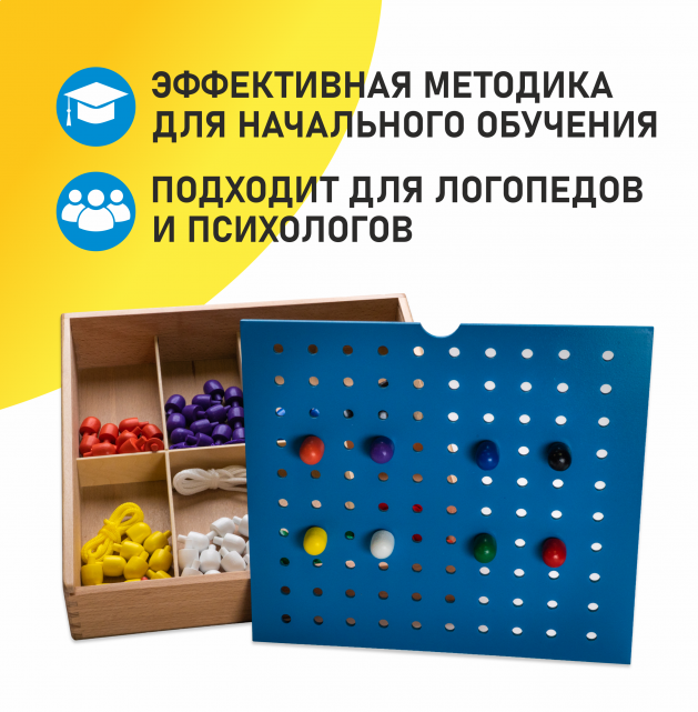 Модуль № 12 (J2) включает отсортированные по цвету фигурки на ножках и комплект шнурков (мозаика, шнуровка). Развивает зрительно-моторную координацию.