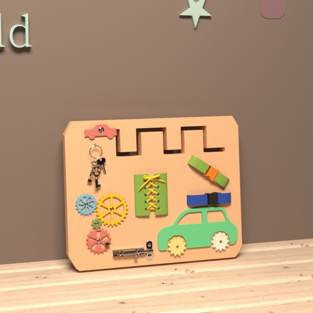 Развивает мелкую моторику у малышей и улучшает координацию движений. Помогает детям чувствовать предметы на ощупь, различать поверхности. Шнуровка улучшает развитие логического мышления. Движение шестеренки, игра с щеколдой и замком пластиковым помогает детям учиться чувствовать свои движения, развивать ловкость. Также это игрушка идеально подойдёт для повышения концентрации внимания и поможет малышу стать более усидчивым.