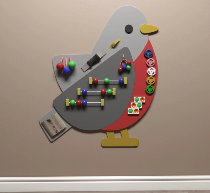 Бизиборд в виде снегиря украсит детскую комнату, а также игровую любого учреждения, что разнообразит занятия, улучшит память, мелкую моторику и мышление.