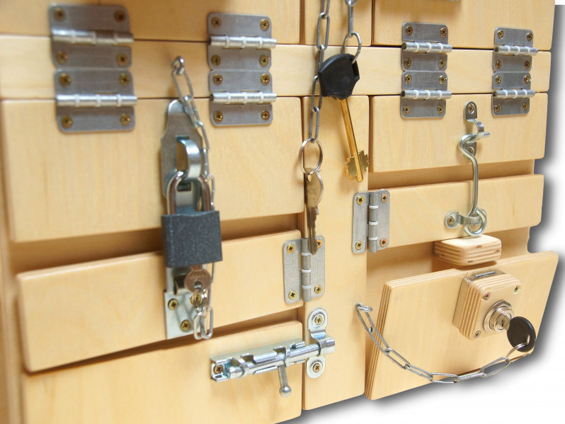 - Разнообразные задвижки, замочки, замки и защелки развивают мелкую моторику, логику и координацию движений у ребенка.