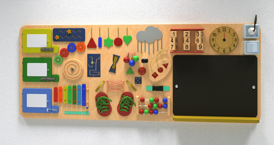 Бизипанель – это удачное сочетание настенной игровой панели и бизиборда. Она больше, обычный компактный бизиборд и более функциональна, чем стандартная настенная игровая панель, так как оснащена большим количеством игровых приспособлений. Основание представленной модели выполнено в спокойном нейтральном бежевом цвете, а игровые элементы выделяются яркими акцентами.