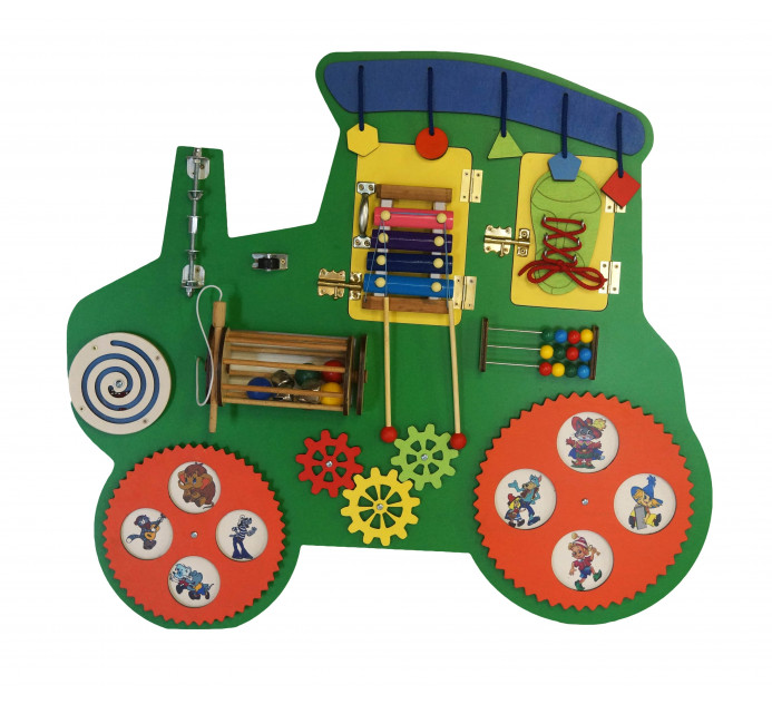 Настенная панель в виде трактора – яркий, красочный игровой элемент с дидактической ценностью. Многофункциональна и компактна. Представляет из себя фигурную деревянную доску в форме трактора, оснащённую разнообразными яркими элементами для приобретения детьми дошкольного возраста полезных навыков в формате игры.