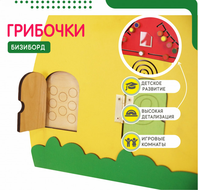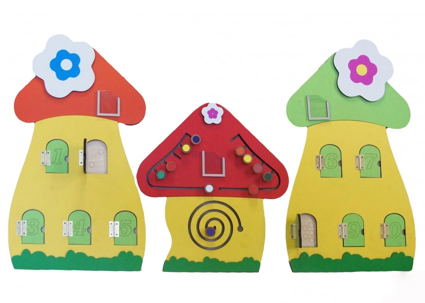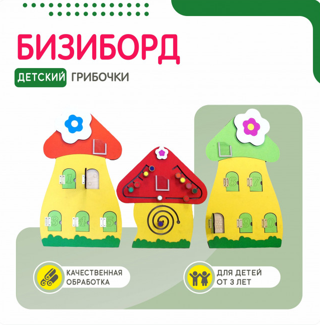 Бизиборды для обучения счёту — это тройная деревянная дидактическая панель, основа выполнена в виде трёх лесных грибочков. На поверхности панелей размещены кармашки для сменных карточек с цифрами, подвижные панели с числами от 1 до 10, тактильные лабиринты, счёты.