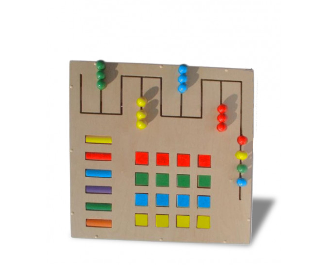 - Получится замечательная игра, если малыш сам будет стараться перемещать кружки. На панели представлены разные геометрические формы: квадраты, круги и прямоугольные палочки. Показывайте на каждую и вслух произносите цвет и форму фигуры.
