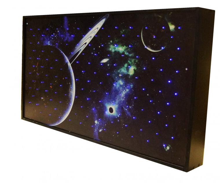 Настенный модуль на тему галактики станет отличным дополнением в сенсорную комнату. С помощью этого изделия у детей развивается зрительная память, снимается стресс и поднимается настроение. Модуль выполнен из фанеры, на которую нанесен принт галактики, с обратной стороны панели вставлены специальные волокна премиального качества, которые имитируют звезды. Одним из главных достоинств является мощный источник света, при котором волокна хорошо светятся даже днём, так что не обязательно затемнять комнату шторами. Изделие выполнено из натуральных материалов, и отвечает всем требованиям безопасности. В комплекте идет беспроводной пульт управления, переключающий режимы работы. Изделие поставляется в собранном виде в упаковке, предотвращающей повреждения при транспортировке.