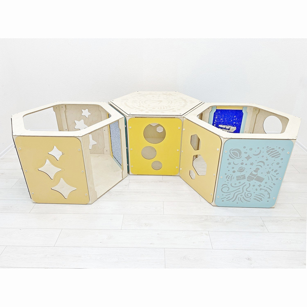 Внутри модули украшены тактильными панелями для развития сенсорной чувствительности, а снаружи – лазерной гравировкой и фигурными окошками. Они идеально стыкуются между собой и позволяют конструировать из них замки и лабиринты для маленьких непосед.