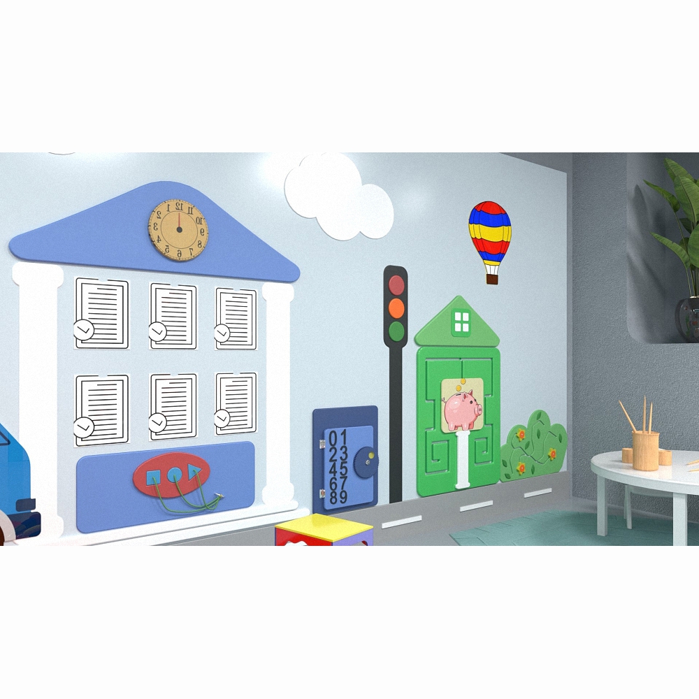 Огромная настенная панель «Банк» - оптимальное решение в вопросе оформления детской игровой зоны для просторных помещений. Выполнена в едином стиле, украшена объёмными, красочными фигурами и оснащена множеством развивающих и развлекательных приспособлений.