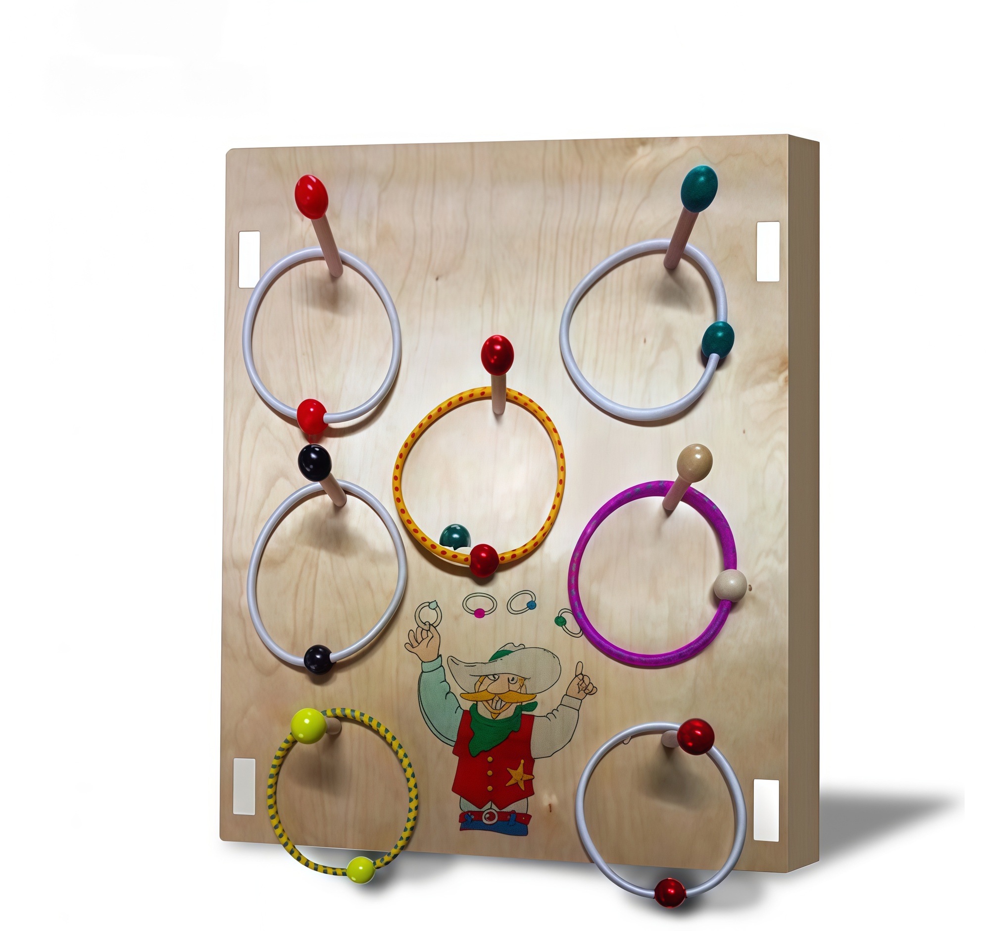 Тактильно-развивающая панель для меткого ковбоя выполнена из экологического материала, и не оставляет в детских ручках зацепки. На деревянном прямоугольнике расположены деревянные палочки с круглым наконечником. Необходимо закидывать и попадать резинками на палочки. Во время игры дети тренируют свои пальчики и мышцы кисти, это активизирует речевые центры в головном мозге. Навык поможет детям быстрее говорить и формулировать свою речь. Играя, дети передвигают пальцами кольца, неосознанно тренируют ловкость рук и гибкость, а у родителей появится свободное время. Это игра поможет переключить внимание с активных игр и сосредоточится на мишени. “Меткий ковбой” заинтересует как маленьких детей, так и постарше, а родителям поможет сохранить дом в целости и сохранности.