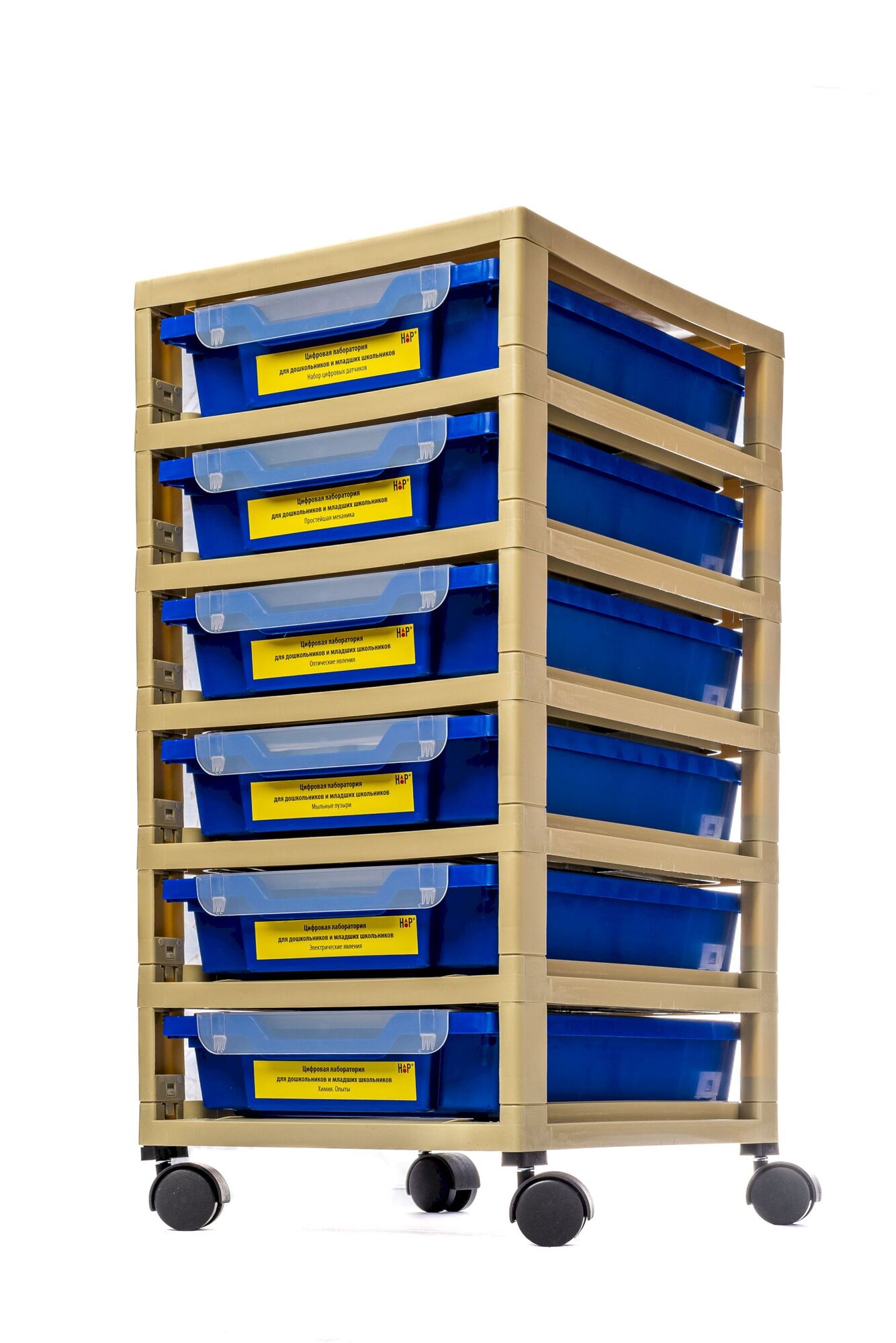 Для компактного размещения, хранения и транспортировки единовременно всех систем хранения с оборудованием в составе цифровой лаборатории предусмотрена мобильная стойка на колесах для размещения одновременно всех 6 систем хранения.