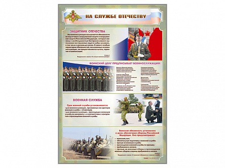 Стенд представляет собой панель, на которой размещена информация, касающаяся службы Отечеству. Стенд предназначен для наглядного отображения информации о воинской обязанности, военной службе и формирования у учащихся или курсантов осознанного отношения к защите Отечества.