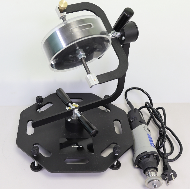 Модель гироскопа с двумя степенями свободы (гироскоп Фуко) смонтирована на основании с противоскользящими опорами и закрепленной на ней прецизионной механической системы подвеса гироскопа.