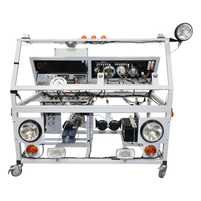 Конструктивно стенд-тренажер представляет собой объемную рамную конструкцию, имитирующую шасси автомобиля КамАЗ, на которой смонтировано все электрооборудование автомобиля КамАЗ с компоновкой узлов в подобных реальному расположению, узлы соединены между собой с использованием адаптированной штатной электропроводки. В качестве привода генератора используется электродвигатель постоянного тока.