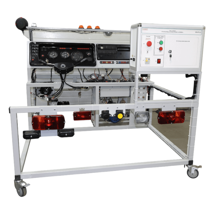 Стенд-тренажер предназначен для изучения электрооборудования автомобиля КамАЗ, отработки навыков поиска и устранения типовых неисправностей, которые возникают в процессе эксплуатации автомобиля, техническому обслуживанию и ремонту автомобиля, получению навыков по диагностике неисправностей электрооборудования.